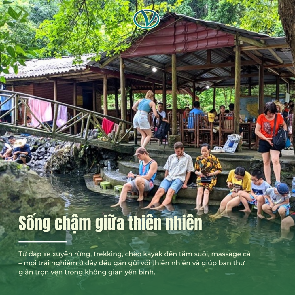 – Chèo kayak, tắm suối, massage cá – những hoạt động thú vị mang đậm chất “sống chậm” giữa thiên nhiên.